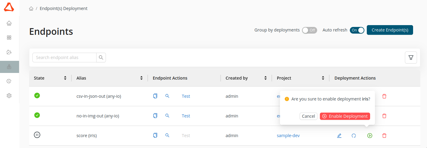 iris, and this value will appear in the endpoint URL as$deployment_path. All endpoints belonging to the same deployment include the same$deployment_path.Project - Assuming that you triggered the dialog from within the Content tab of the project, your Project name is pre-filled. Otherwise, select a project from the dropdown list.