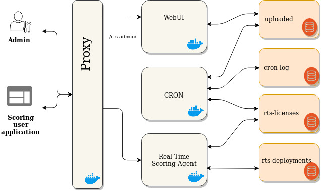 docker-compose.ymlfile defines a dedicated docker network (rts-internal-network) for the Real-Time Scoring containers, so they can communicate with each other, but from the external network only the proxy container is available on the 80 and 443 ports. You can use this ports for scoring, and to reach the Web UI (eg. http://localhost, http://localhost/rts-admin/ https://localhost, https://localhost/rts-admin/ or any other IP address or domain name). - The cron container needs the docker socket to be mounted in order to be able to manage (e.g. restart) the other containers. In case this is omitted, you have to restart the proxy container manually after uploading a certificate, and restart the real-time-scoring-agent container after a license is provided or changed.