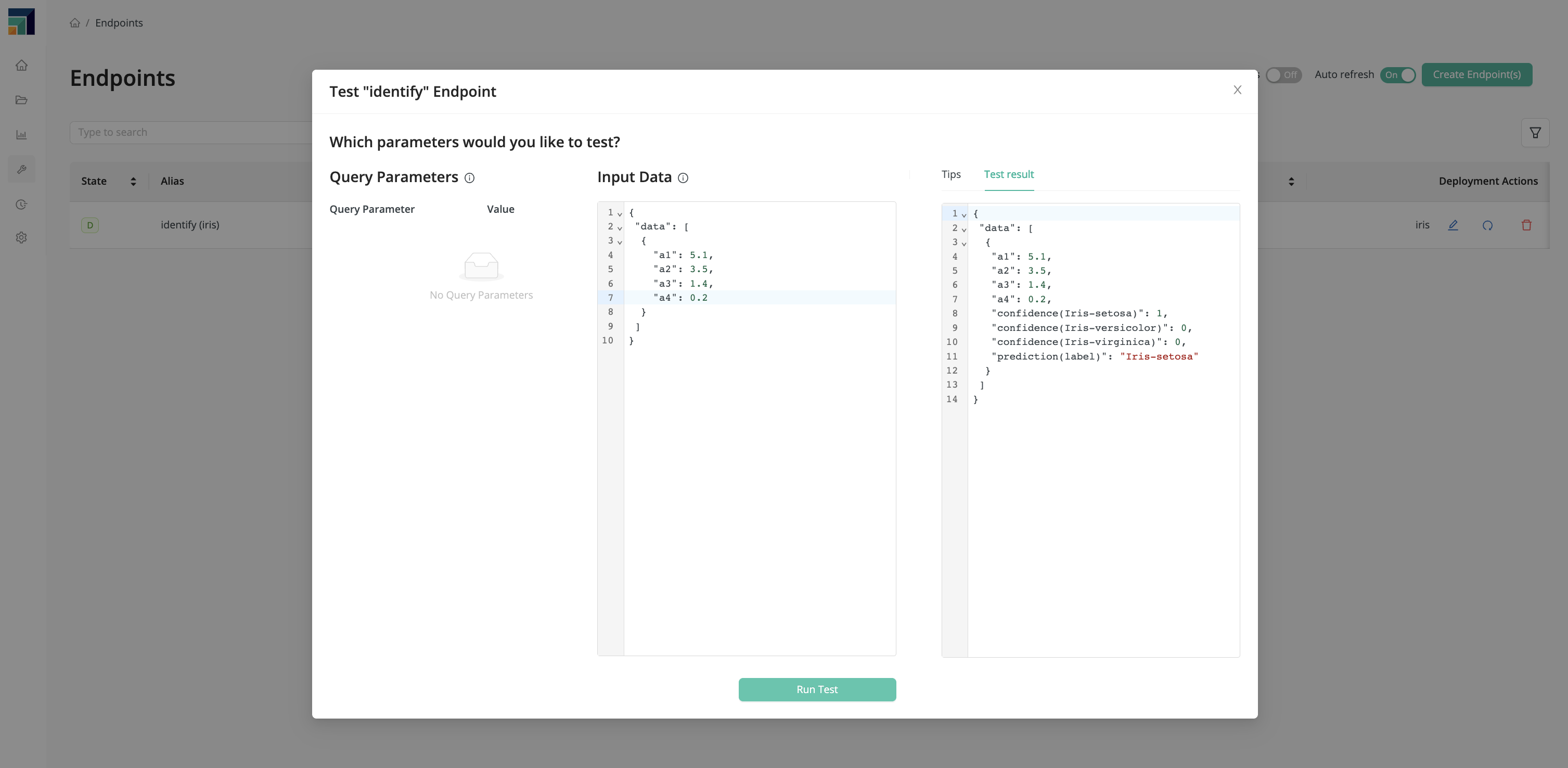 Within the Endpoints menu of Altair AI Hub, under Endpoint Actions, click on Test to get a test page for your endpoint. Insert your JSON-formatted input data and click Run Test.
