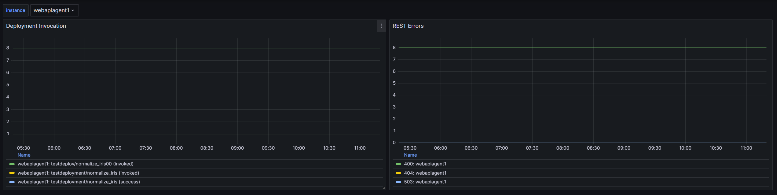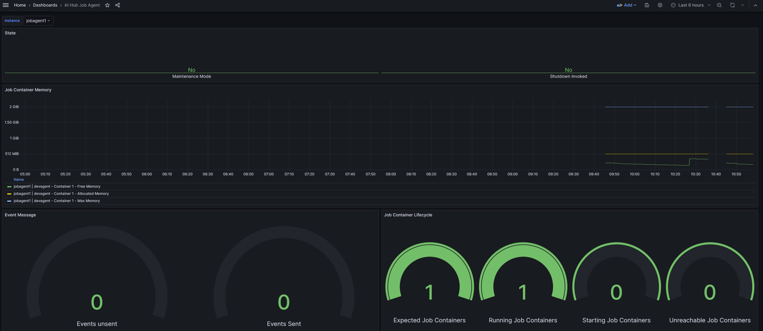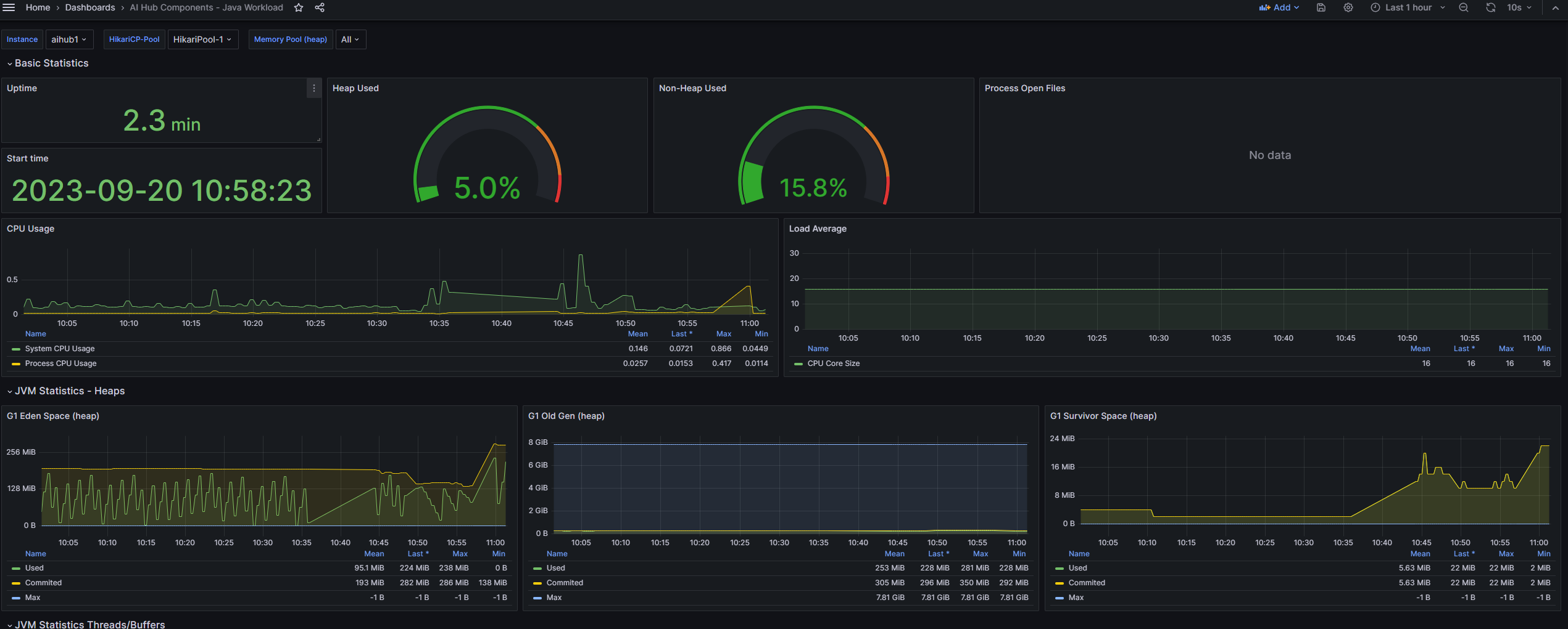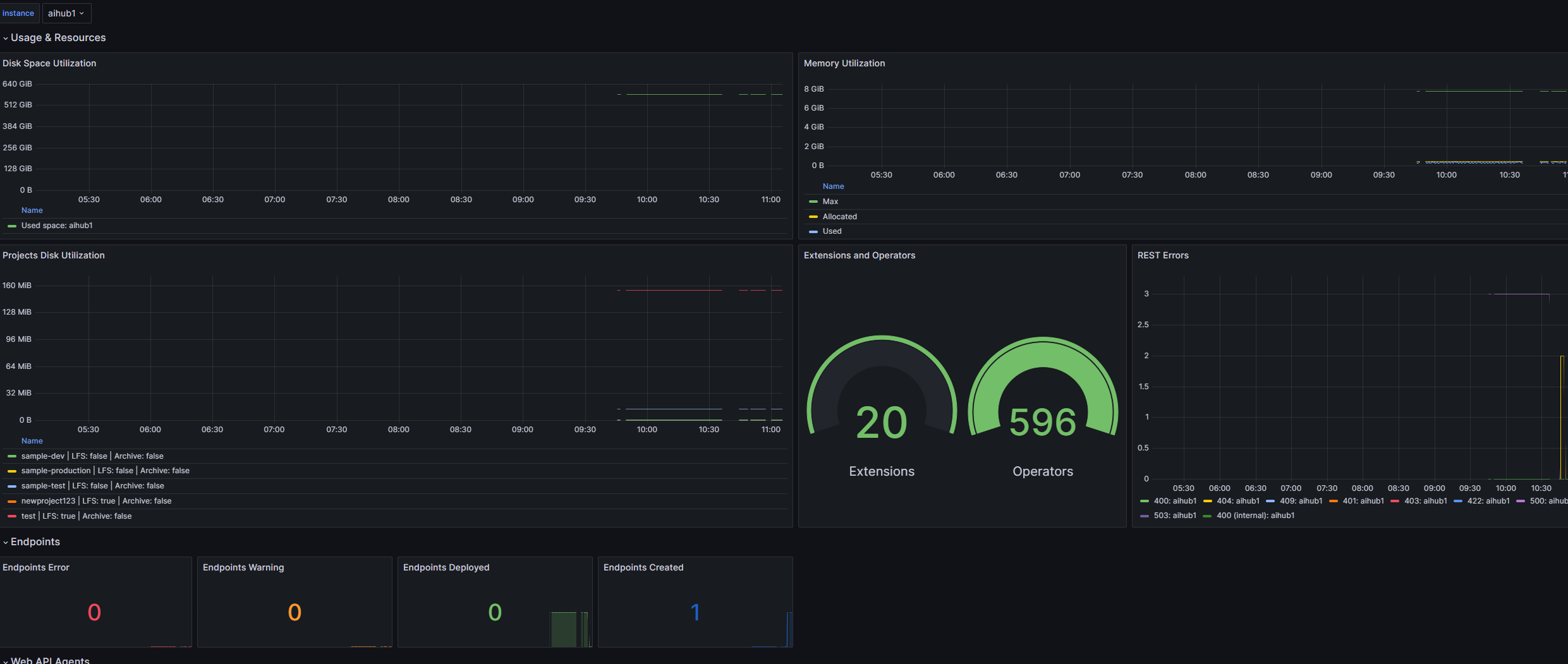 Importbutton to import the dashboard. - You should now see the imported dashboard with metrics from AI Hub Server, Job Agent, Web API Gateway and Web API Agent.