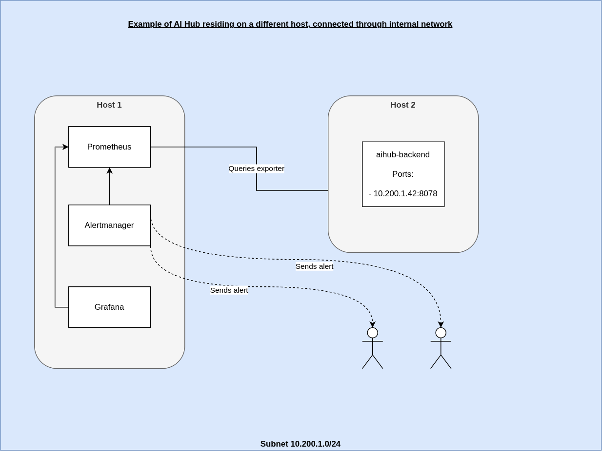 AI Hub components offer Prometheus exporters. Prometheus is an open-source monitoring and alerting system that collects metrics from various sources, stores them, and provides a flexible query language to analyze the data. This document outlines which data is available and how a Prometheus, Alertmanager, which handles alerts sent by client applications such as the Prometheus server, and Grafana, a visualization tool that works seamlessly with Prometheus to create beautiful and customizable dashboards, setup might look like. The suggested set up would install a Prometheus instance for the collection of metrics, Grafana for rendering the metrics as charts and Alertmanager for providing Alert functionality. If Alertmanager should not be used, Grafana also has alerting functionality.