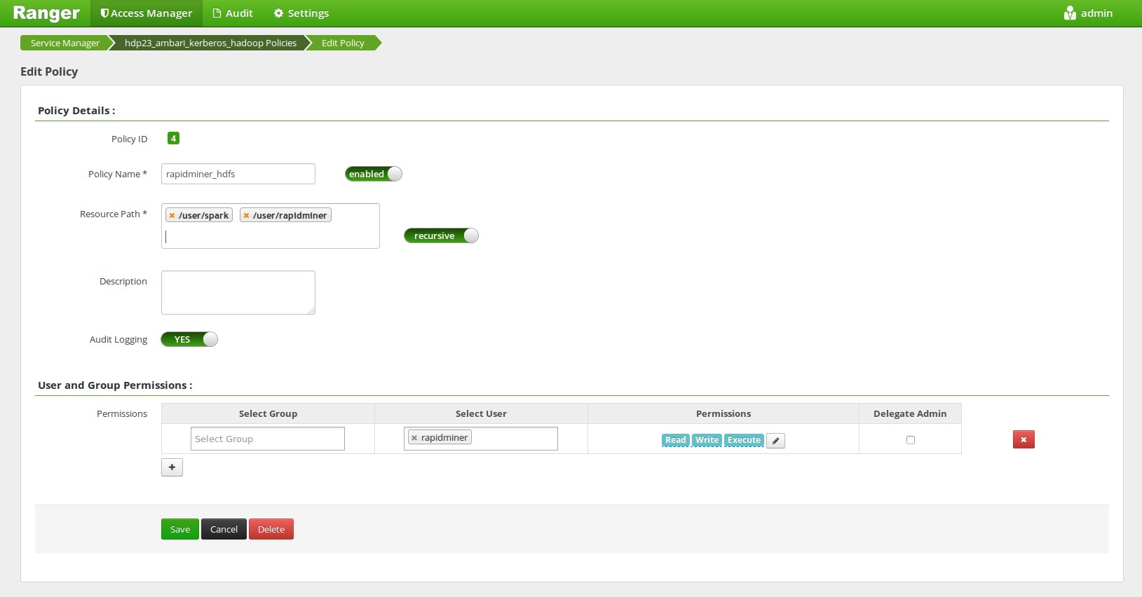 Create a Ranger HDFS Policy, that allows any HDFS operation within the users home directory (in our case the rapidminer user). If you are using SPARK and the Spark Assembly is located on the HDFS (e.g. in the /user/spark folder) then this user needs to have access to this folder also.