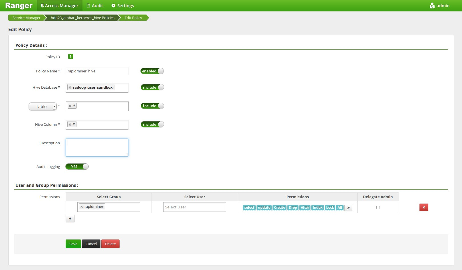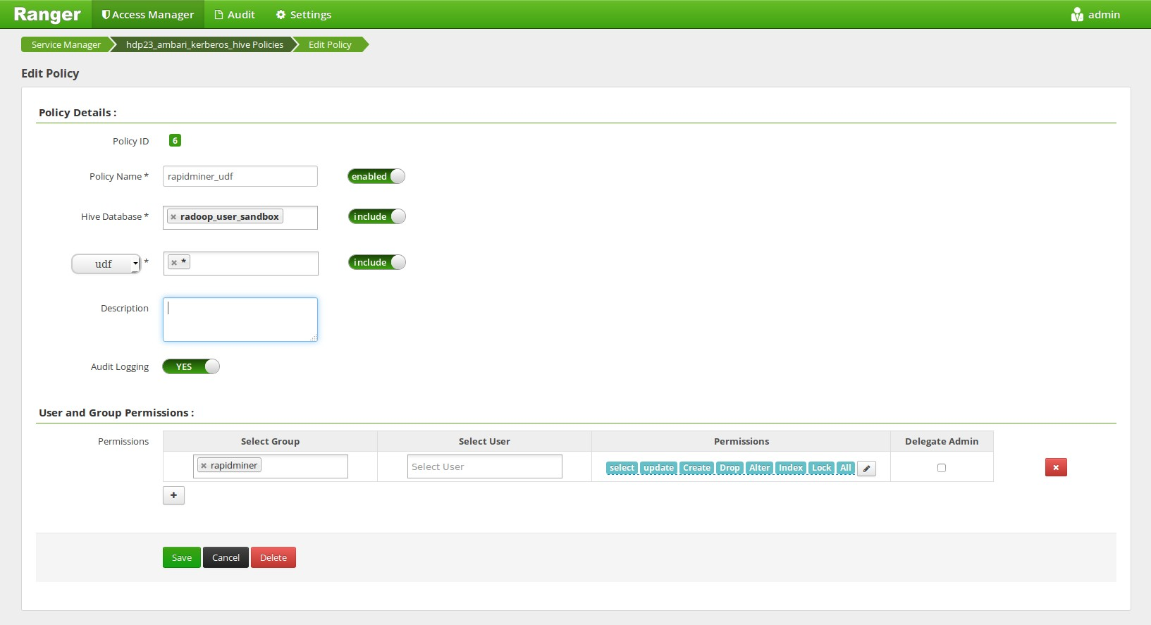 Rapidminer Radoop uses custom UDF execution in Hive queries. Without using Ranger, JAR files are uploaded to the HDFS and the UDFs are constructed based on those JARs. It’s possible to keep this behaviour with Ranger by creating a Ranger Hive Policy, that allows the execution of all UDFs of this database for the user. In this case the UDFs are upgraded automatically when you upgrade to a new Radoop version. If the policy cannot be set for any reason, please see the Installing Radoop functions manually section to install the UDFs on the cluster manually.