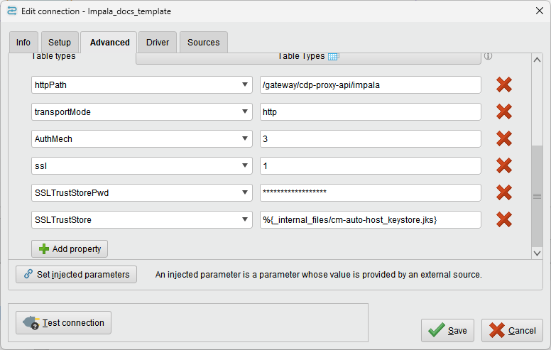 Property Value Description ssl1Enables SSL encryption transportModehttpUses HTTP transport mode httpPath/gateway/cdp-proxy-api/impalaPath for Knox gateway AuthMech3Username/password authentication SSLTrustStore%{_internal_files/keystore_filename}Path to the keystore file (use this format for referencing files added in driver additional libraries) SSLTrustStorePwd<password>Password for the keystore