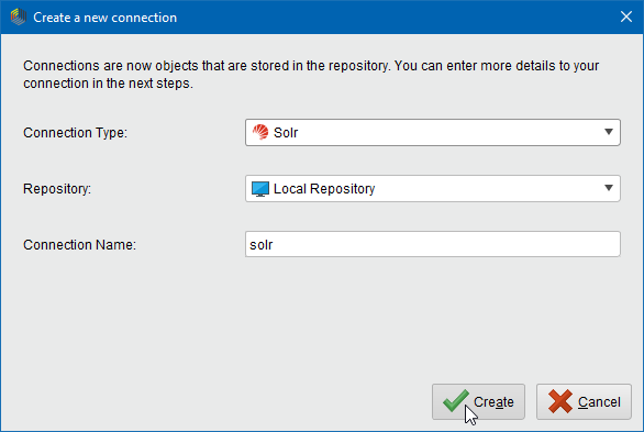 Create Connection and select the repository from the dropdown of the following dialog.Enter a name for the new connection, and set Connection Type to