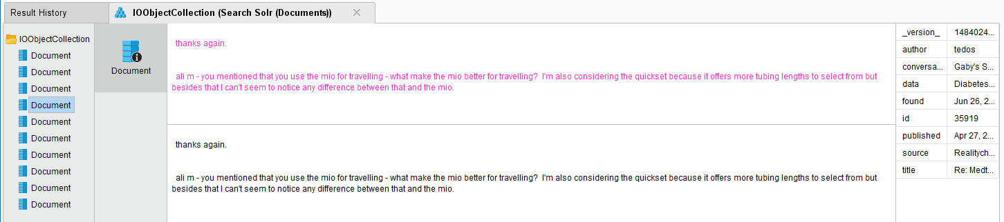Now every Solr entry is transformed into a Document instead of a row as for the Search Solr (Data) operator.